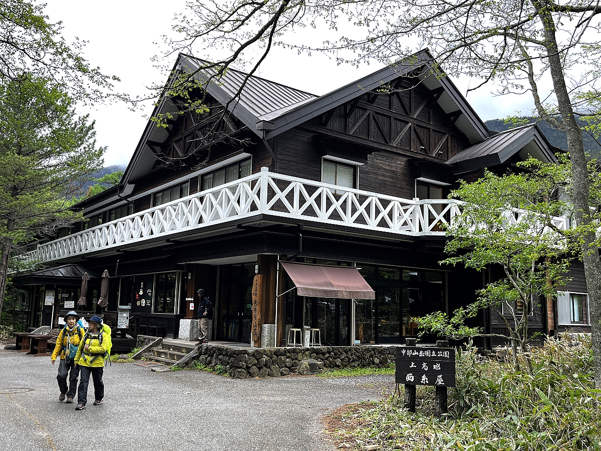 「西糸屋山荘」是上高地百年老字號旅宿,名稱來自從事紡織業的本家-島々糸屋,因為是往西方分家,所以稱為西糸屋。最初(1928年昭和3年)為了登山野營的旅人而在上高地租地開小商店,1928年在隔壁增建兩層樓小旅館「山宿 西糸屋」,1962年本館完工,更名為「上高地西糸屋山荘」,自此一直是登山者往返槍岳・穗高岳途中熱門旅宿,2023年迎接創業100年。