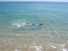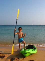 這次重點是在望安,因為前一次的絕美沙灘一直令我們魂縈夢牽,所以就算住的是簡單鐵皮屋、吃的是民宿越傭家常菜,我們還是安排了三天兩夜在此度過。一早太陽才剛冒出來,羅小牛就一溜煙衝到沙灘堆城堡、曬日光浴、,划小舟到海上探險、跳到海裡浮淺,整天在海邊玩得不亦樂乎,連正午太陽赤炎炎都不嫌累,要三拖四請才不情願的回房間避開這段最熱會曬傷的時刻。