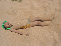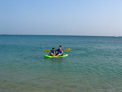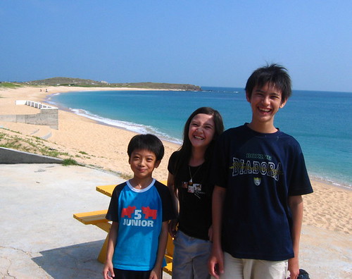 這次巧遇來自高雄大樹鄉Steve一家人,爸爸是英國人、媽媽台灣人,兩個小孩都是遺傳了父親外表,輪廓相當清秀(啊,媽媽也是很漂亮的),小五的女生尤其漂亮,聽到她叫Emma更令我忍不住聯想Jane Austin筆下的英國淑女。小朋友們很快混熟打成一片,一起堆沙堡、浮淺、划小舟,晚上還向老闆借來超大探照燈到沙灘抓螃蟹。大人們則一邊喝著在附近雜貨店買來的紅酒和啤酒,一邊閒話家常。Steve是學歷史的,對臺灣史有相當的研究,所以和Alan聊得非常起勁。媽媽們就是聊媽媽經囉,兩個小孩都是在台灣出生,但是隨著年齡增長,需要學習的科目也越來越多,尤其老大已經唸國一了,因為在台灣無法學到正規的英式教育(像英國文學史、英國歷史等),所以打算在這一兩年搬回英國,不過英國的房價、物價都不是一般人所能負擔,所以他們也很頭痛,但是為了孩子,萬不得已還是要咬緊牙關回去吧!