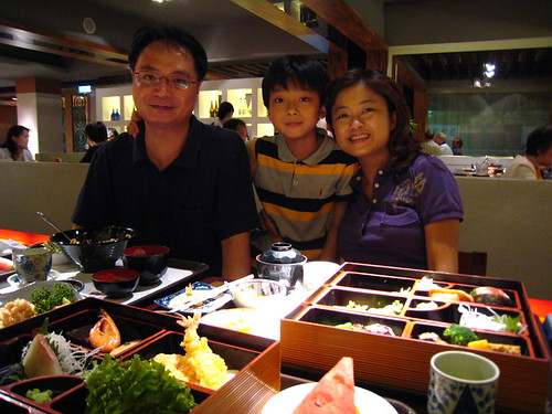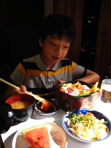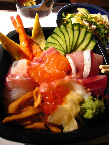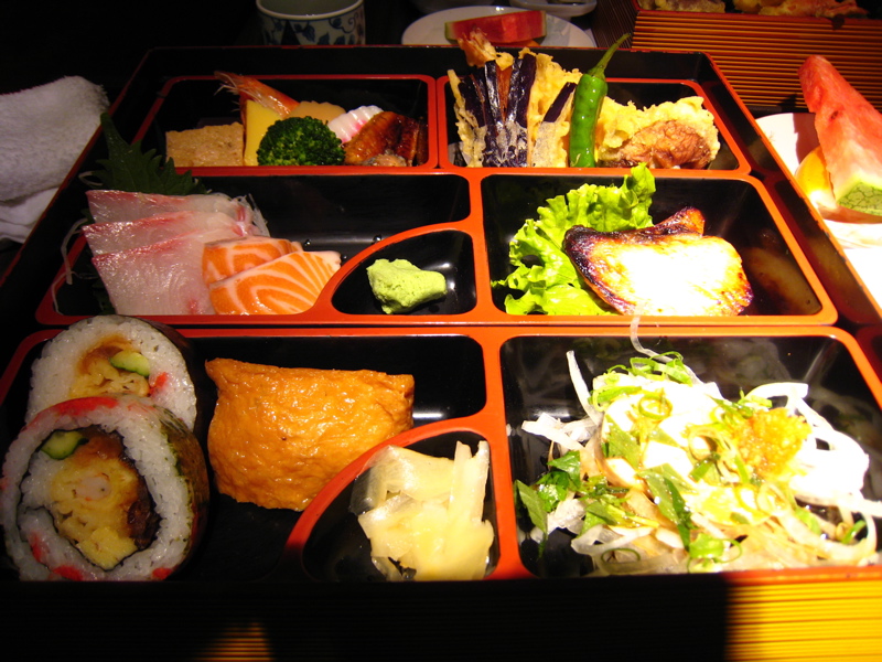 安康魚肝(應該算前菜吧,安康魚在日本料理中是十分高級的魚種哩)、食事(花壽司和豆皮壽司)、生魚片(鮭魚和安康魚)、蒸品(鰻魚蝦魚板油豆腐等)、炸物(炸蝦炸野菜)、烤品(烤味噌魚),早知道份量這麼多就不必先點綜合生魚片了。
