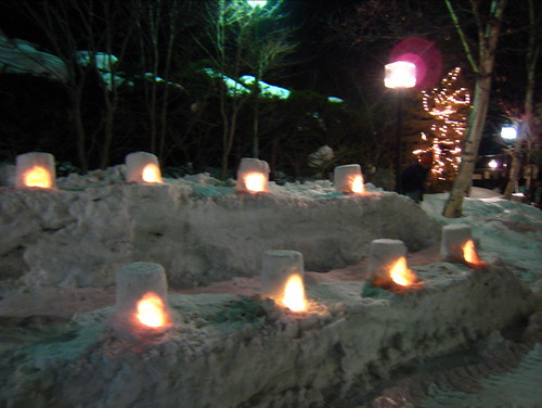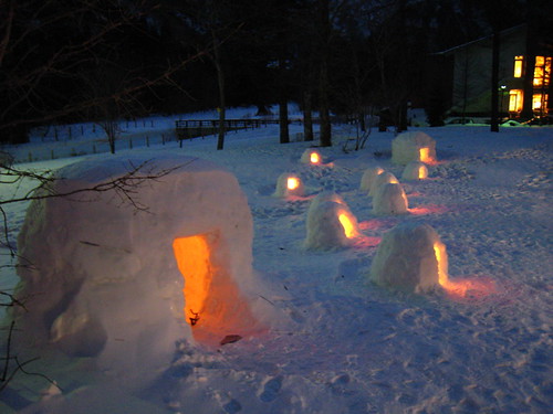餐後回到房間,從窗外望去,令人屏息的雪景就在眼前,一年一度雪燈祭即將來臨,旅館先在自家雪地上蓋了一個個小小雪屋,裡面點蠟燭。點點燭光在雪屋裡若隱若現,為寒冷漆黑的夜裡帶來陣陣暖意,美麗得像一幅畫。我們坐在窗前陶醉在這難得一見景象中,真希望時光靜止一下下。。。