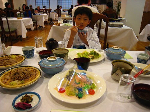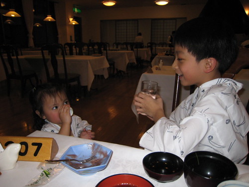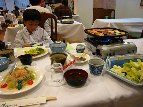 晚餐不用說,當然又是滿桌的豐盛菜餚,我們點了鐵板燒,山產野菜一道道上桌令人應接不暇,吃飯的時候,隔壁桌一個很可愛的小妹妹還跑來敬酒,深邃的輪廓長得很像混血兒,媽媽也不太像日本人。一問之下,原來媽媽是菲律賓人,爸爸沖繩人,怪不得小妹妹那麼かわい。