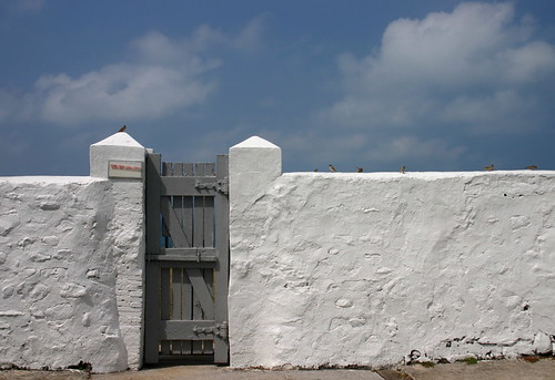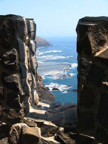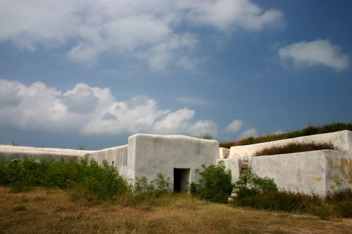 澎湖 有西台古堡和東台古堡,但是前者的名氣大得多,因為西台古堡是目前澎湖唯一有正式開放的砲台,列為國家一級古蹟,是觀光客必到景點。東台古堡從清朝興建 至今一直被列為軍事管制區,前幾年才解除管制,規模比西台古堡小一點。我們沿著彎彎曲曲的濱海公路找了許久,終於在一堆草叢之後發現這處鮮為人知的古砲台。雖然已經開放,可是縣政府還沒有積極整理,週遭雜草叢生,看起來蠻可憐的。不過這般無止盡的荒涼倒是散發出歷盡滄桑的淒美,尤其在陽光照耀下,一大片雪白的城垣折射出炫目光芒,在孤寂隱身荒煙漫草中一甲子後,終於可以重見天日,古堡若有靈一定很歡喜。登上外垣俯瞰壯闊的浪濤海景,一股天蒼蒼野茫茫排山倒海的氣勢迎面襲來,滄海一色,令人有寄蜉蝣與天地,渺滄海之一粟的感慨,一世之雄而今安在哉?