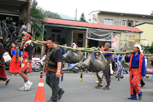 哇!頭一遭看到活生生被扛的山豬~~~左邊數來第一位就是新郎