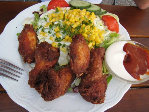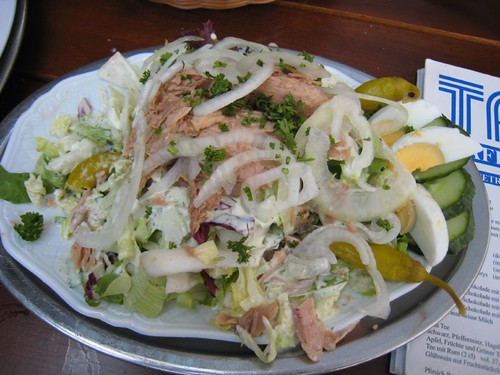沒想到這家庭園餐廳生意這麼好,用餐時間幾乎座無虛席,翻開meau,價格出乎意料之外的便宜,菜色種類很多,德文下都有英文說明,每一道看起來都好美味啊,不過我們還是保守的點了義大利麵、鮪魚沙拉、牛排、炸雞共四道主食。等待上菜的時候,翻開手邊的Lonely Planet德國篇,才發現原來這家餐廳竟然是編輯首選,真是誤打誤撞、太幸運了,美食得來全不費工夫!