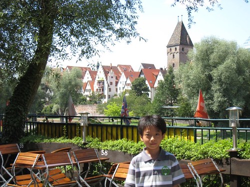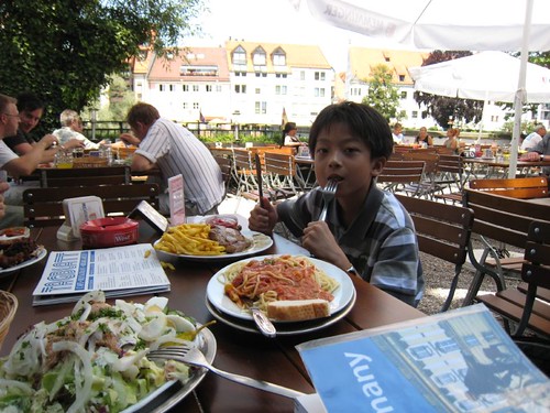 就在十分鐘前,好不容易在烏姆對岸的新烏姆( Neu-Ulm )找到停車位,準備到老城裏覓食,大家飢腸轆轆加上小牛尿急,路上看到這家隱藏在濃密樹蔭後的庭園餐廳,傳來陣陣香味,顧不得價錢,先進去再說。