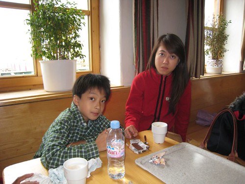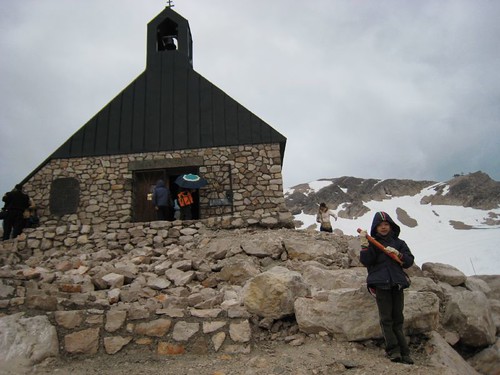 冬天的楚格峰是精雕玉琢的雪白世界,到了六月,雪已經融化得差不多,只剩一點點殘雪。氣溫低於零下5度,還颳風下雨,不過小牛看到雪就樂歪了,不停冒雨玩雪。山頂車站位於一大片岩場上,金屬造型非常富現代感,在冷颼颼的戶外賞完景後到原木打造的最高餐廳喝杯熱飲,真是再舒服也不過了!
