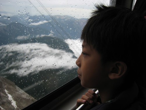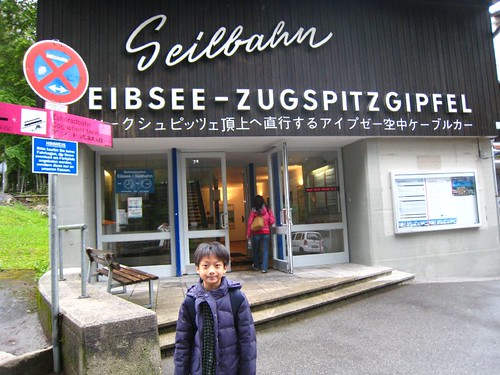 Eibsee纜車站也是德國最高的纜車站,從這裡到山頂的纜車軌道全長4450公尺,卻只要十幾分鐘!尤其第二段軌道幾乎呈垂直角度,登山纜車貼著陡峭的岩壁急速往上升,非常驚險,看著窗外一片霧茫茫,狂風大雨敲打在纜車上,我們屏息扶著把手,深怕搖搖晃晃的車身一不小心掉落萬丈深淵。不過一旁的德籍遊客依舊談笑風生,可能對這種情況見怪不怪了。很難想像當初築路工人是如何攀爬山崖開闢軌道,實在是一項非常艱巨的工程。