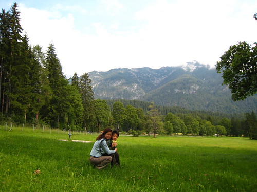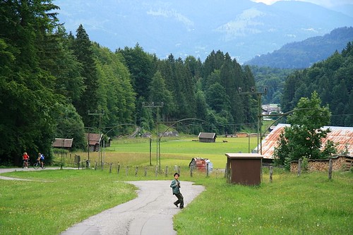 我們從G.P.開車到Füssen這一段屬於阿爾卑斯山之路的中間地帶,一路上,以宏偉的阿爾卑斯山脈為背景,錯落有致地點綴著巴伐利亞地區獨特樣式的村莊民宅、山形屋頂,映襯著蒼翠的森林草原,放眼望去,每個景致都像一幅畫。