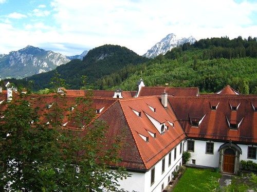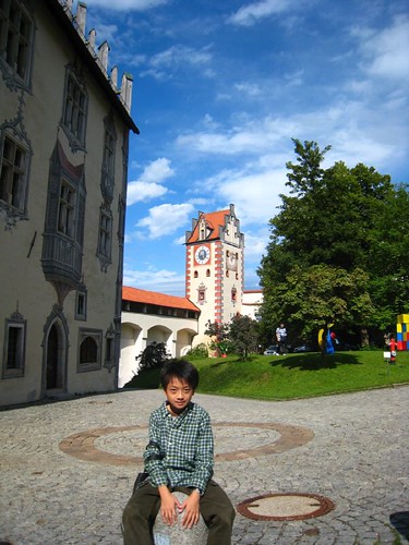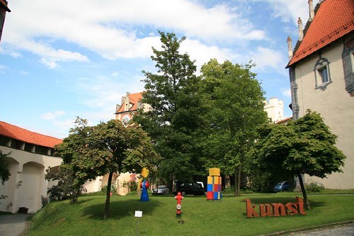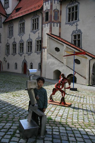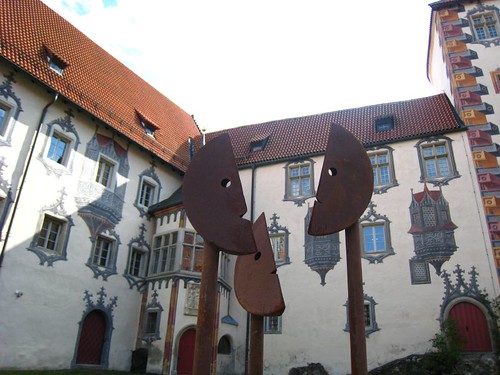 繼續漫遊,參觀了8世紀奠基的聖曼克休道院(Kloster St-Mang),再爬上彎彎曲曲的山路來到矗立在南邊山丘的全鎮最高處–郝恩斯堡Hohes Schlos。這座15世紀建的大主教避暑城堡,是德國境內歌德式晚期建築風格代表性城堡之一,現在一部分闢為巴伐利亞國家畫廊,展示宗教美術品和歌德式後期繪畫,大部分蒐藏品都是路德維希二世的祖父路德維希一世收購的。不過我們一邊拍照一邊賞景沒注意到時間,抵達這個至高點的時候,正好要關門了(夏天竟然四點就關門,太早了吧),所以沒辦法看到裏面的收藏品。但是它美麗寬廣的前庭還是讓我們駐足許久,擺放許多造型奇特與童趣盎然的後現代藝術品,牆面繪製了幾可亂真的幻想繪畫,十分特別。從城堡展望Füssen,綿延到天際的紅色屋頂相當羅曼蒂克呢!