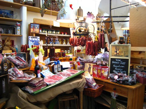 先來到最熱鬧的街道Reichen街,兩旁有許多紀念品店、咖啡廳,還有傳統超市,裏面賣各類農產、肉類加工製品和傳統食材,並且附設小小咖啡座。坐在裡面一邊喝咖啡一邊看著人來人往採買,非常有意思。Füssen的Information Center就在這一帶,也值得一看,因為資料相當多,也有中文版(可惜是簡體字),感覺得出來這個小鎮對於拓展觀光業的用心。