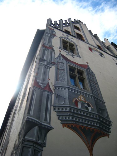 我們下榻的旅館Hotel zum Hechten就位於舊城區,check in後大家迫不及待出門逛逛。和大多數羅曼蒂克大道的小鎮一樣,Füssen也屬於小巧精緻型。比較特別的是,她是巴伐利亞地區最高的城鎮(海拔808公尺),房舍都依山坡而建,巷道迂迴曲折。不過主要觀光區域集中在直徑400公尺左右的舊城區,所以在這裡不需要地圖,隨性漫步都會輕鬆到達目的地,沿途還可以發現許多趣味。