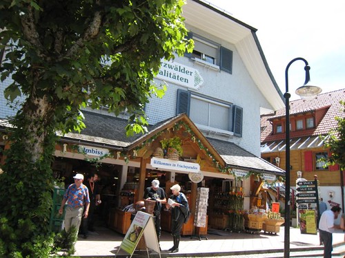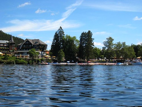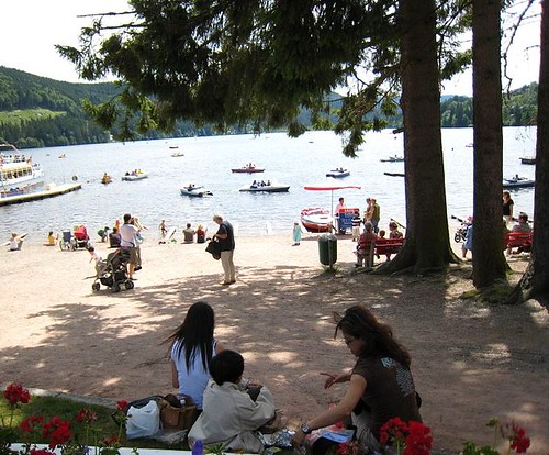 湖旁的Strandbadstrasse街道上,滿佈農畜產品店、度假旅館、餐廳和紀念品商店,遊客絡繹不絕。我們在一家農產品店發現許多黑森林特產:蜂蜜、德國香腸和燻肉、黑森林木雕手工藝等,如獲至寶,而且價格相當合理,立刻展開血拼行動。直到肚子咕嚕咕嚕叫,才發現早已經過了午餐時間,趕快停止採買,先填飽肚子再說。