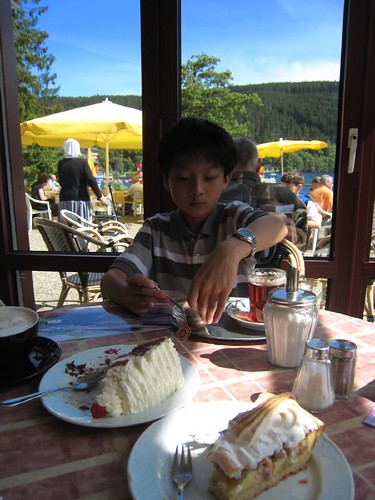 買了麵包夾德國香腸和沙拉坐在湖畔吃,一邊欣賞這片碧綠山湖,簡單的食物變得格外美味。吃飽了,看到湖畔林立的露天咖啡座,找一家景觀最好的,入境隨俗來盤黑森林蛋糕,佐以湖光山色迷人美景,靜靜享受這刻骨銘心的幸福。