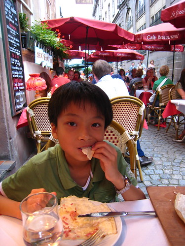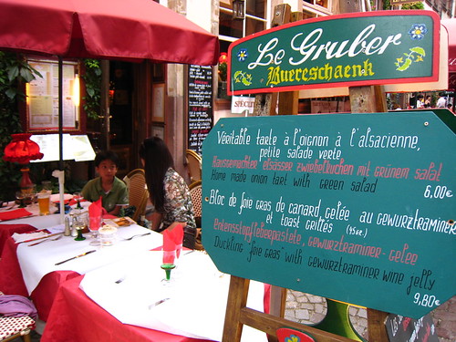 以前就耳聞到法國自助旅行最傷腦筋的就是三餐,法國餐廳食物既貴份量又少,吃一餐都要花不少錢還不見得吃飽。所以有的背包客乾脆買一條法國麵包啃整天。這趟去歐洲,幸好在亞爾薩斯停留好幾天,讓我們母子免除了啃麵包的日子!待在亞爾薩斯有啥好處呢?且聽我慢慢道來。