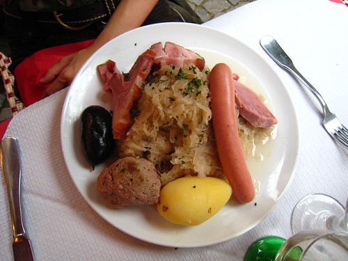 以白葡萄酒燉煮豬腳肉、香腸、豬血腸、醃酸菜的拼盤Choucroute Maison。