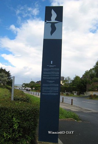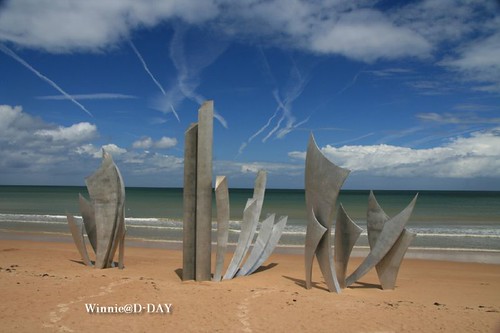 當我們來到當年隸屬奧馬哈灘頭的St. Laurent-sur-Mer海邊,沙灘上3座巨大不銹鋼雕塑突然映入眼簾,原來是2004年6 月6 日諾曼地登陸60週年,法國雕塑家特別製作獻給陣亡美國將士。跟許多遊客一樣,我們第一眼也覺得很突兀,但是看到銘刻的說明了解它深刻意涵後,不禁深受感動。