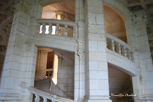 螺旋式雙梯位於城堡主塔中央,是由兩座不同入口的獨立螺旋式石梯環繞同一個空心實柱為軸心,相互交錯盤旋而上貫穿城堡三個樓層,如果兩個人同時各在一個樓梯上下樓,可以透過空心實柱間的窗戶看見對方,卻不會擦身而過。這樣巧妙的設計是國王為了避免皇后和情婦們面對面相遇引起尷尬或是大打出手的苦心安排。由於1516年達文西曾經應弗朗索瓦一世邀請去翁布瓦茲堡住了一陣子並且在那裏走完人生旅程,所以後人推測這座兼具建築學、工程學、力學、美學的神奇樓梯,是出自達文西的設計。我們本來不太懂這座樓梯的巧妙之處(因為簡體版導覽的說明語焉不詳),奇怪!上上下下都會遇到啊!後來一人各到一座樓梯分別上下樓,才恍然大悟,真是非常有趣與饒富創意的發明!