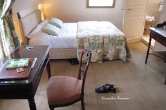 La Tortinière位於Tours南方10公里的小山頭上,可以俯視中世紀小鎮Montbazon。四周保留自家耕作的農地和遼闊的狩獵森林,視野非常讚。這家城堡飯店的歷史最早可以追溯到西元1562年,那時做為領主的莊園,不過只是樣式質樸的木造宅邸。現在的面貌是1866年起草歐陸法知名律師之一的遺孀Pauline Dalloz重新打造,屬於法國文藝復興風格。城堡本身不大,相當精緻高雅,每個房間格局不盡相同。本來我以為城堡會陰森森的,沒想到法式城堡完全不會,挑高樓層與多扇大窗戶,採光通風相當好。儘管建築物本身有一把年紀了,處處還是可以感受到主人優雅的品味與悉心佈置。