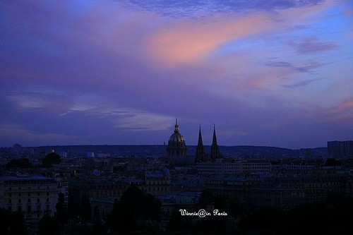 遠方的蒙馬特山丘聖心堂、更遠一點的新凱旋門、近處的傷兵之家、艾菲爾鐵塔,