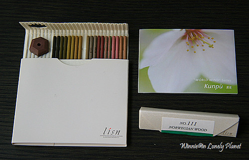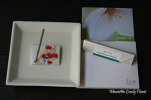 從『Lisn』的商品企劃更可以發現松榮堂想將香道推廣至全世界的野心,所有產品清楚標示著英文名稱與說明,例如我買的第111號線香叫Norwegian Wood(挪威森林),說明寫著:Foliage in Woods,是森林裏樹葉的香氛,適合Night/Fresh(心情好的深夜),短短幾行英文對不懂日語的我以及許多觀光客來說,真是一大救贖啊!不但讓我們更輕易了解每隻線香優美的背景,店員流利的英文也令訪客有賓至如歸的感受。有興趣可以去瞧瞧它的網站,就可以大致體會我所說的後現代風格喔!