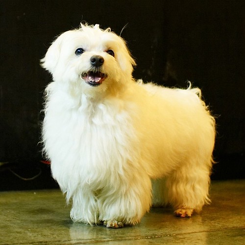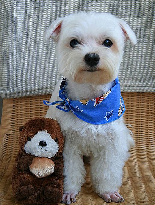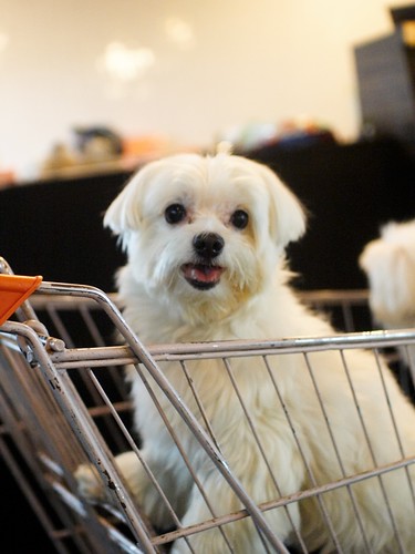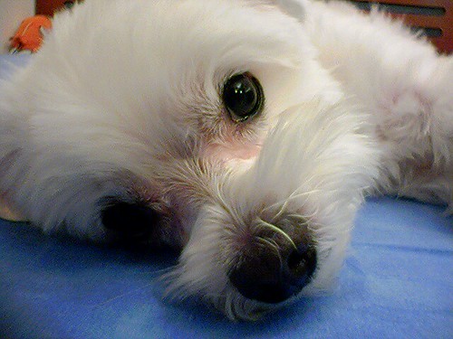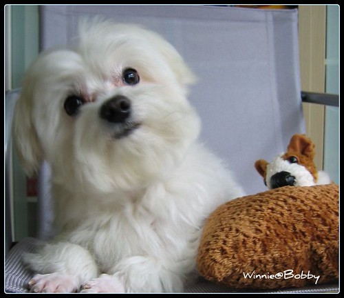 那次南下婆家,懷孕3個多月的我和老公去夜市閒逛。走著走著,突然看到路邊擺著一個狗籠,裡面有一隻母瑪爾濟斯和兩隻小瑪爾濟斯。原來狗主人生小孩,剛好母狗也生小狗,怕小狗們吵到嬰兒,所以託朋友在夜市寄賣。兩隻小狗才兩個月大,ㄧ隻文靜的趴著,ㄧ隻活蹦亂跳。我從小就對瑪爾濟斯情有獨鍾,一直非常希望能擁有,看到這兩團雪球的可愛模樣,頓時腳像被黏住捨不得離開,當下決定買一隻。本來我們相中安靜的那隻,想說比較不吵,可是老闆說活力充沛比較好養,勸我挑活潑的。正在考慮的時候,一轉頭,發現原本靜不下來那隻突然睜著黑溜溜的大眼睛望著我,好像有話要說。我被牠慧頡的目光吸引,心想:就是牠了!
