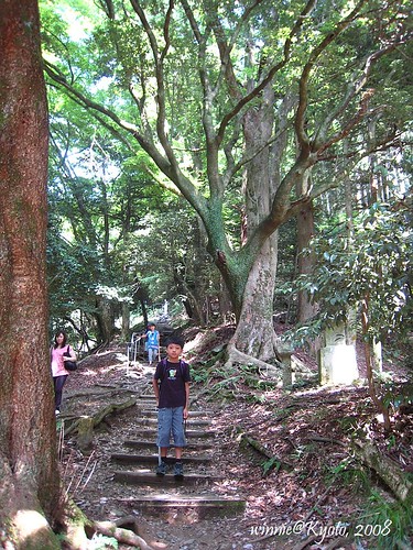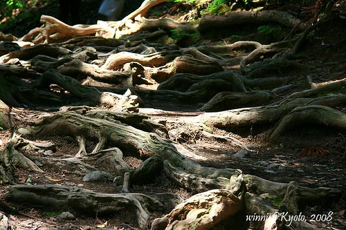 走完鞍馬九十九轉,參拜了金堂,繼續來到「木の根道」,年幼的牛若曾經在這裡奔逐嬉戲,或是不畏闇夜練習大刀。望著浮出地面磐根交錯的巨大樹根,不禁感嘆造化弄人,就像糾纏的樹根永遠有打不開的結。平清盛當初在平治之亂殺光源氏家族,卻赦免2歲小娃兒牛若與14歲的源賴朝(後來建立鐮倉幕府),絕對沒想到這2個小孩會在他死後成為滅絕平氏一門的關鍵人物。而義經滿心期待與同父異母兄長源賴朝相認的時候,更不會料到在他屢建戰功,壇浦海戰瓦解平家,幫兄長奠定源氏再起大業後,卻遭到源賴朝妒恨轉而追殺,最後被逼得在奧州自盡。冤冤相報綿延幾世代,枉死的魂魄數也數不完啊!