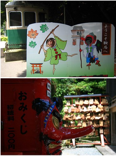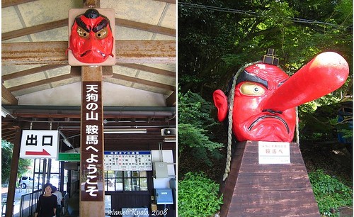 拜現代交通便利之賜,鞍馬山搖身一變成為熱門健行路線,鞍馬走到貴船,慢慢走大約只要兩個半小時,可說是老少咸宜。從出柳町搭乘叡山電車,搖搖晃晃沿著比叡山腳奔走,三十分鐘就可以抵達寂靜的鞍馬站。車站到仁王門受付所的一小段路是很有味道的商店街,處處看得到天狗面具與塑像迎接著旅人,自從日本戰神源義經在此度過艱苛童年後(註1),義經、天狗似乎與鞍馬山劃上等號。