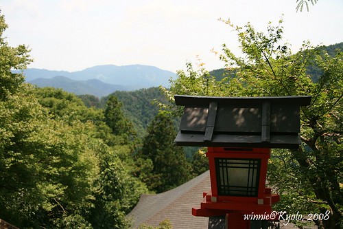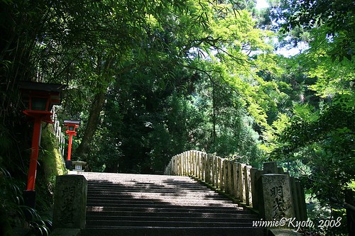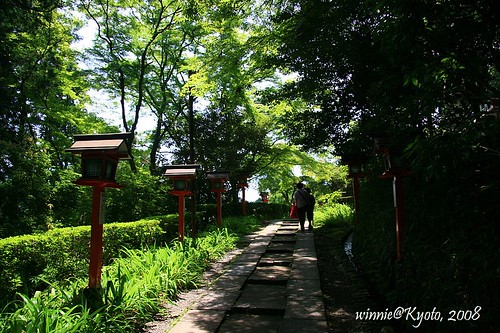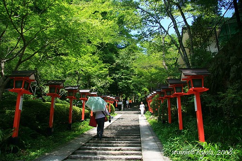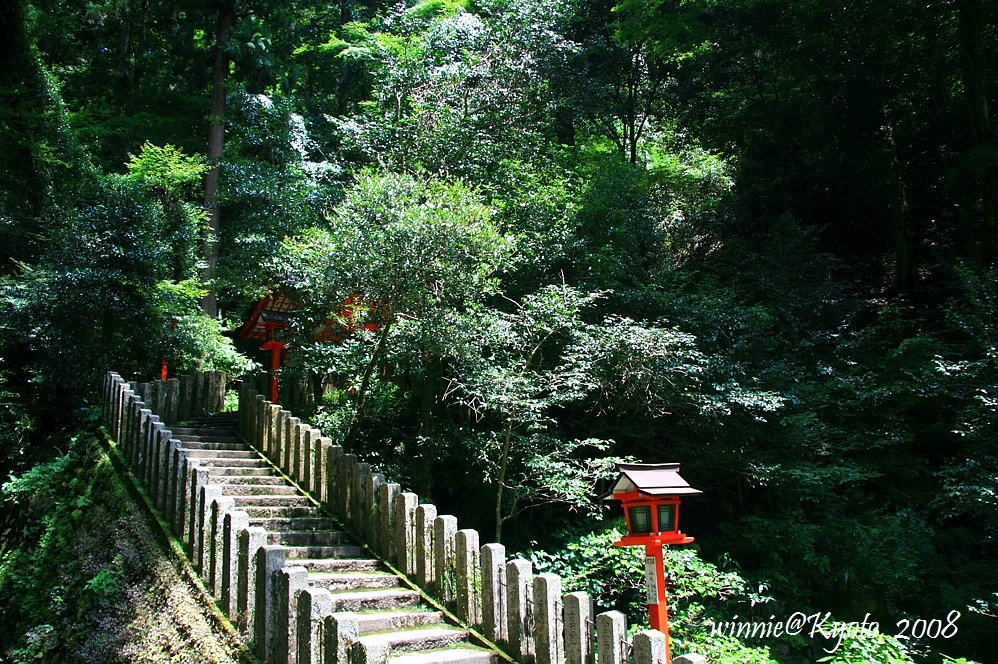 沿著潺潺的鞍馬川,過了仁王門,開始進入連續上坡的參拜道,據說到山頂的本殿金堂有九十九個轉彎,不知道是否真的有人算過,不過連平安時期著名文學作品《枕草子》都曾經描述:「似近又遠的鞍馬九十九轉」,應該不會差太遠吧。或許是四周景物太美了,走在彎曲陡峭的上坡路絲毫不覺得累,蒼翠蓊鬱的林木隨著微風吹拂發出沙沙低喃,朱紅色燈籠在老樹、石板路襯托下更加古色古香,沐浴在綠意盎然的清新大自然中通體舒暢。