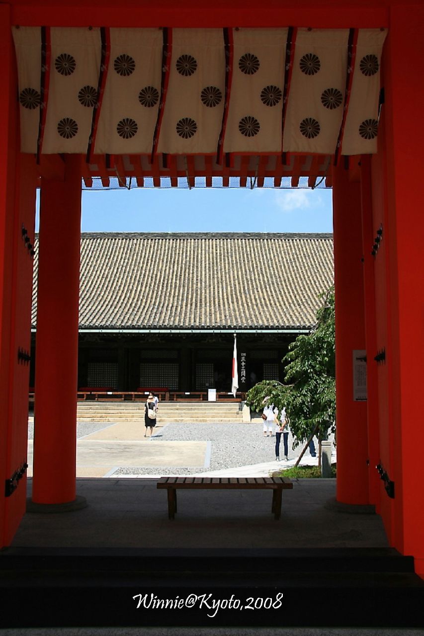 在如此廣大的御所蓋佛舍當然不成問題,權勢如日中天的平清盛,為了討上皇歡心,傾豐厚財力與人力,幫他打造一座純檜木興建,全長達120公尺的神聖殿堂,外加一座五重塔。120公尺的佛舍正面以柱子分割成33間(1間約1.8公尺),所以通稱三十三間堂。三十三還有更深一層意涵,《法華經》的《觀世音菩薩普門品》當中提到,觀世音菩薩有三十二種化身,因應眾生需要現身說法。後來,佛教徒據此繪製了三十三種觀音菩薩畫像,代表觀音菩薩變為33種面相拯救眾生,即「三十三觀音」。堂內本來就是供奉一座本尊觀音坐像,與一千座千手觀音立像,以三十三為名真是再貼切不過了!