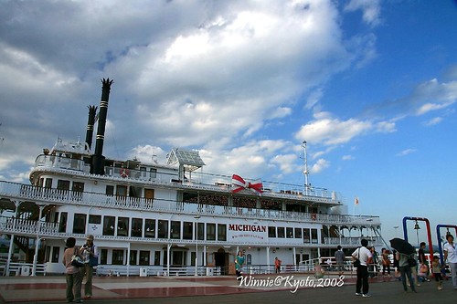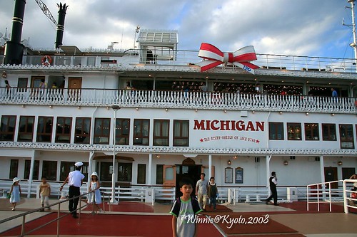 此時候船室已經聚集許多遊客,有情侶檔、有全家大小出遊的、也有一些像我們的外國觀光客,當船駛近港口,雪白的船身在陽光照耀下閃閃發光,咦?雖然船名叫「MICHIGAN」,船身簡直是航行在美國南方密西西比河上的紐奧良蒸汽郵輪翻版(註3),也像加州Disneyland Park的Mark Twain Riverboat放大版(註4)。把美國南方郵輪掛上北方密西根州的名字,一定很多人會誤以為密西根湖裡的船就長這樣吧,其實並不是呦,密西根湖反而只有簡單的帆船。