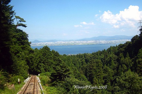 參觀完令天皇頭大的比叡山,我們從東塔走到ケーブル延曆寺車站,先搭坂本ケーブル纜車到山下的ケーブル坂本車站,一出站就有江若Bus等著,一堆人擠上Bus再來到京阪電車石山坂本線的坂本站,從這裡坐電車到濱大津站,一路上,漫無邊際的琵琶湖在一旁如影隨形。