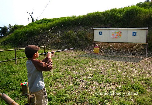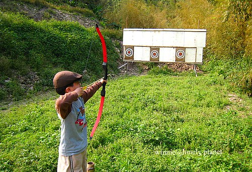來到深山裏,房間又沒有電視,老闆深怕訪客太無聊,還貼心安排了活動:吹箭和射箭,原住民必備技藝,對都市人相對陌生與新鮮。在射箭場拉弓射箭,羅小牛小小個兒也架式十足射個不停,大人都累歪了他還不喊累,練久了越來越接近紅心,算是有一點成績,不過拉弓的手指也紅腫了。