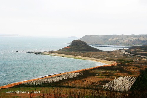 從山頂可以眺望牛心山,牛心山背面山頭就是東台古堡,前面一顆顆白點是煞風景的消波塊