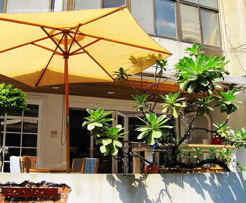 雖然是舊公寓,「私。處」毫不吝惜打造了露天陽台,豎起海灘傘,以木板條架出地板和木製桌椅,配上圍牆邊生氣盎然的植物,為緊張忙碌的都市調劑出悠閒舒適的氛圍。