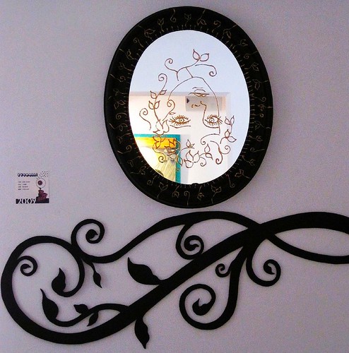此作品是鏡面藝術裝置,鏡子刻了一個女人頭,燈光折射下會反映出鏡子上的影像在白牆上