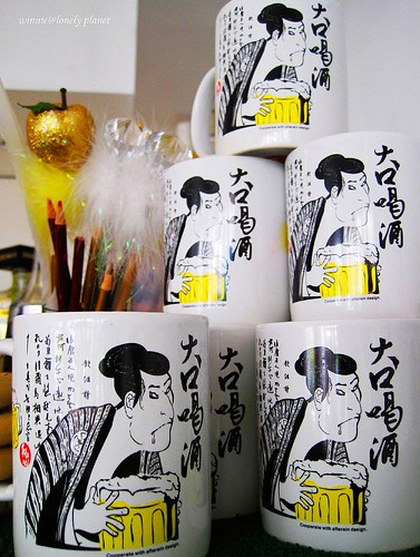「私。處」的室內以白色調為主,手作風格的桌椅、陳設,和匠心獨具的擺飾,讓店裡充滿舒服自在又有個性的調調。一進門,眼尖的我立刻發現白色小方磚砌成的 吧檯上堆了一疊很特別的馬克杯,杯面設計取材自日本知名浮世繪畫家「東洲齋寫樂」的名作「三代大谷鬼次之奴江戶兵衛」,我一看到非常高興,還 來不及坐下就抓店員問這杯子哪來的?有沒有在販售?原來他們還有另一家店賣串燒、關東煮,杯子上的設計是那家店的mark,杯子則是集點的贈品,拿到這裡 來展示兼廣告。能以浮世繪名畫作mark,看來老闆對藝術頗內行。