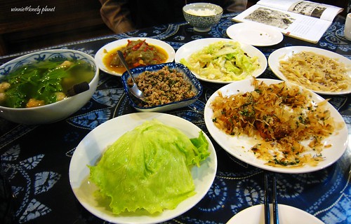 這陣子剛好老爹又去雲南了,錯過聽他講古的機會。晚餐時刻,老闆娘精心烹煮一道又一道擺夷家常菜,擺滿整桌,讓我們受寵若驚。同樣出身自博望新村的老闆,有著少數民族特有的深刻輪廓,稱得上是帥哥一枚,帶著靦腆微笑招呼著。雖然我沒去過雲南(事實上除了深圳還沒踏入大陸本土過),聽著男女主人以雲南話交談,品嚐澎派美味的擺夷餐,被屋裡充滿擺夷風的陳設包圍著,似乎享受了短暫的雲南神遊之旅!