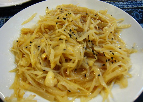 老闆娘費心將馬鈴薯切成細絲,拌入多種香料,清脆爽口