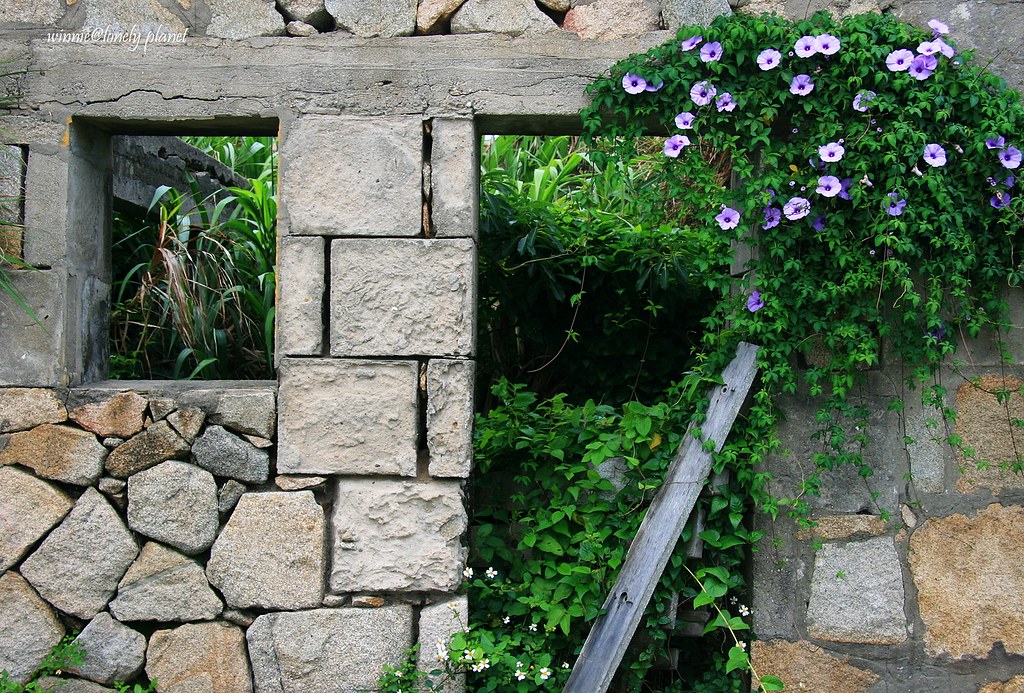 綠意包覆著一幢幢傳統閩東石屋,嫩紫朝顏爬滿斑駁屋垣,幾隻鵝防我們侵入地盤嘎嘎叫著。盎然的生機和歲月浸淫下散發的氣息,交織成迷人氛圍,看不出來這裡已經渺無人煙了。