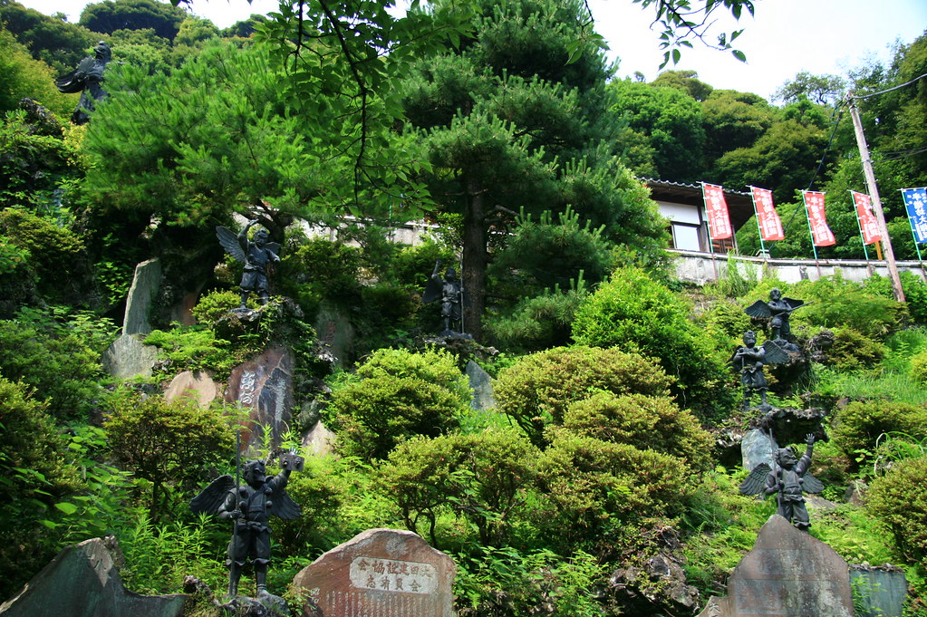 如果像我一樣腳力好時間充裕,配合天朗氣清,更不能錯過它的「登山步道」,走半個多小時連續爬坡路來到半山腰的半僧坊,可以看到一尊尊亂髮高鼻天狗雕像,這正是建長寺守護神。繼續往上匍匐前進,登上至高點→勝上嶽展望台,相模灣躍然眼前。由此去還有全長3.5公里的天園步道銜接鎌倉東邊的瑞泉寺,我們遇到英俊阿多仔氣喘吁吁從那頭走來,想必是一條不輕鬆的路線。因為需時2小時,沒那麼多時間,於是駐足展望台,遠眺數百年來浪淘盡千古風流人物的相模灣。