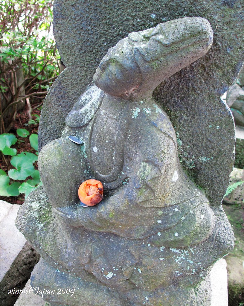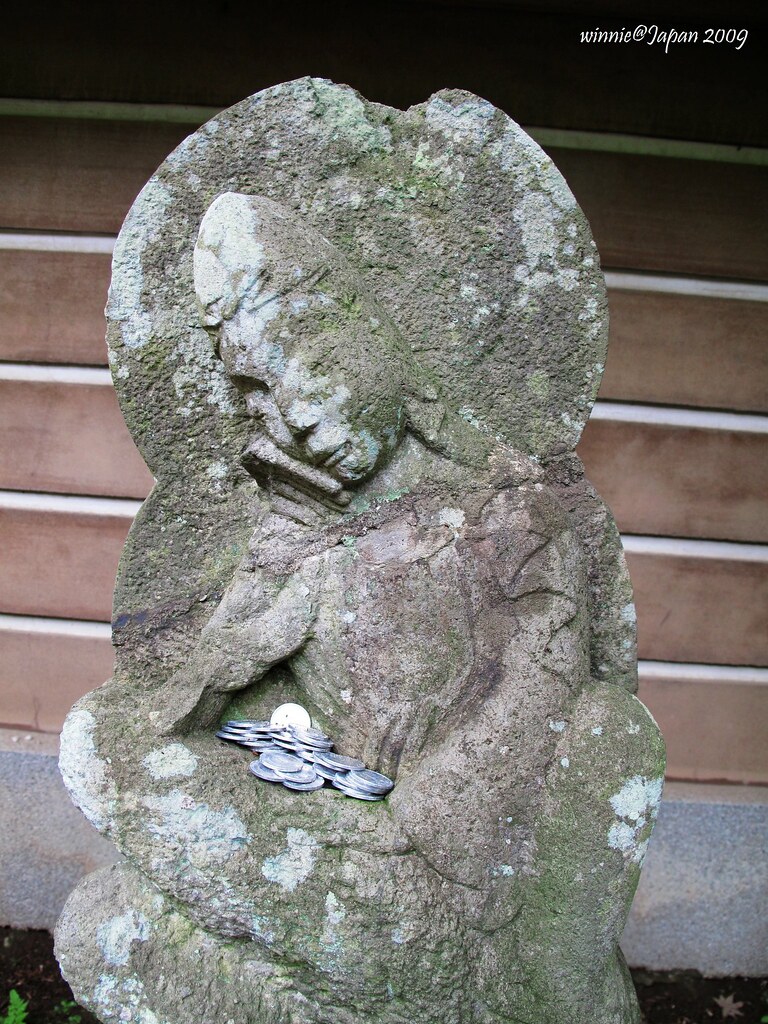 有的觀音被放銅板(祈願?)、有的乾脆直接放水果
