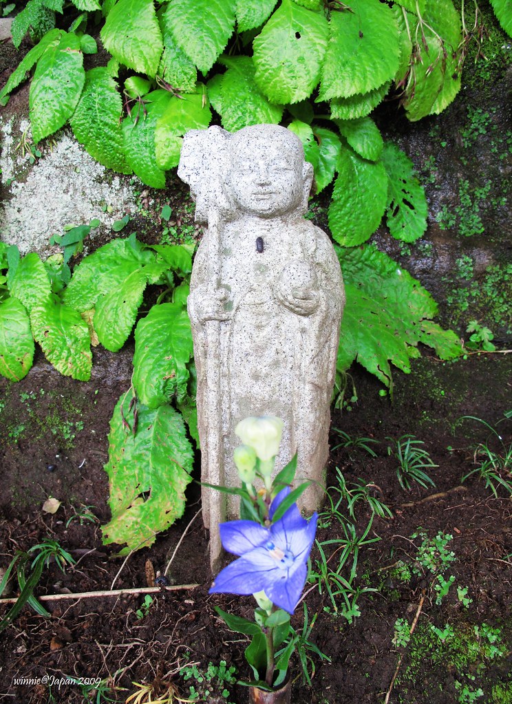 紫花、綠葉與地藏相映,禪意十足