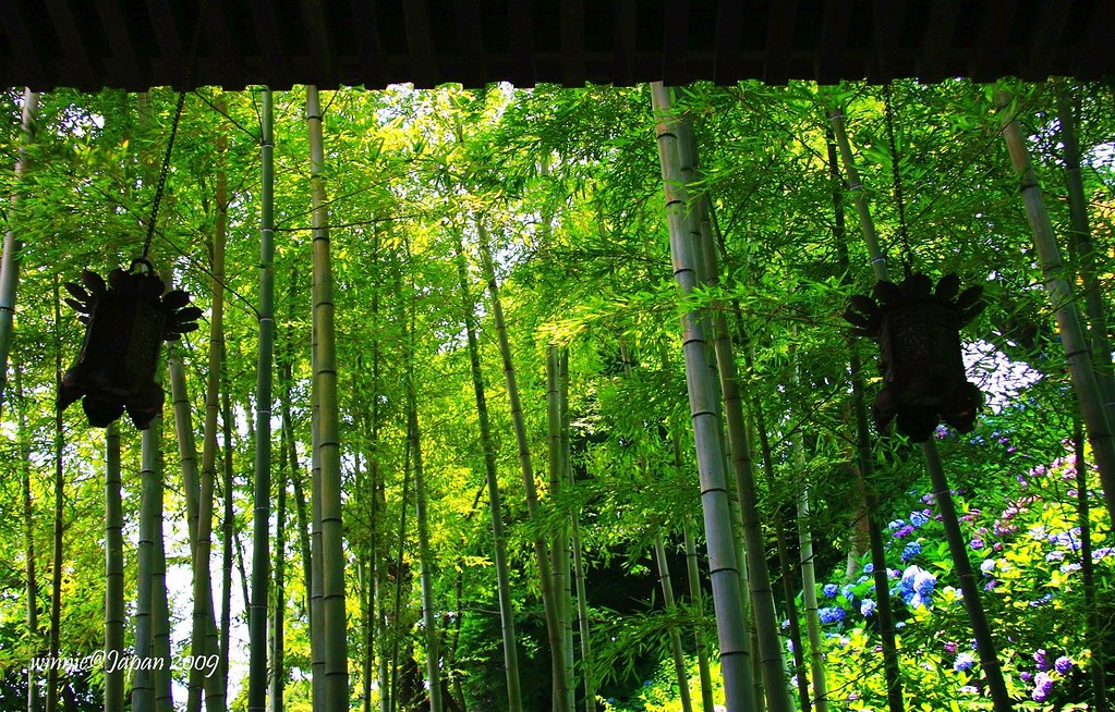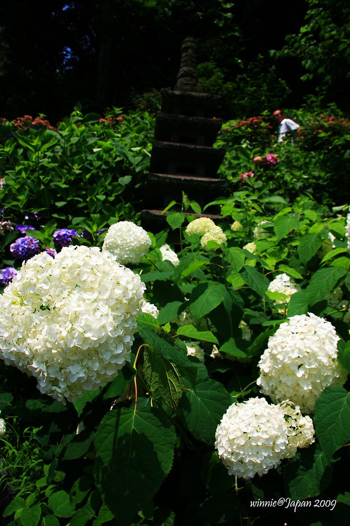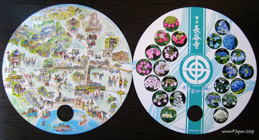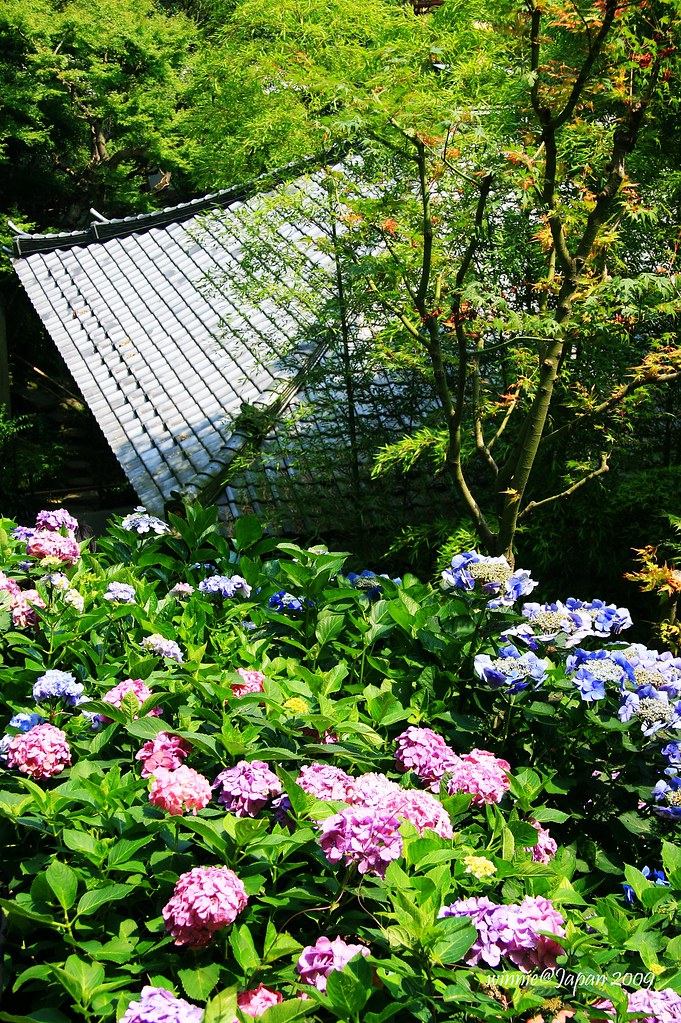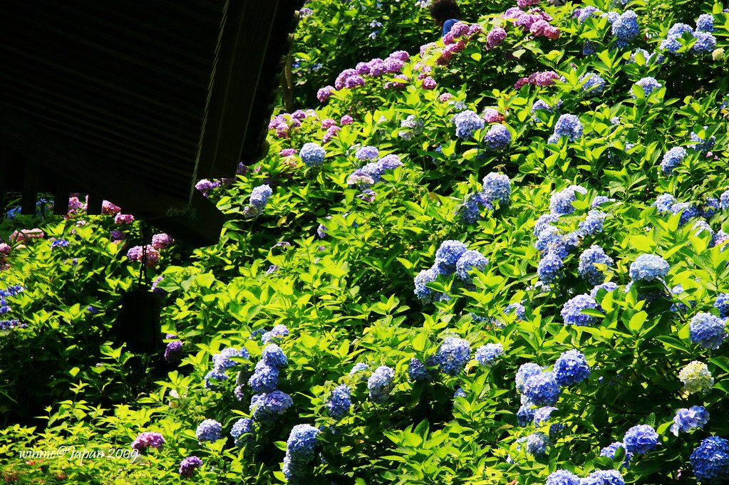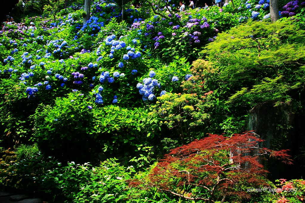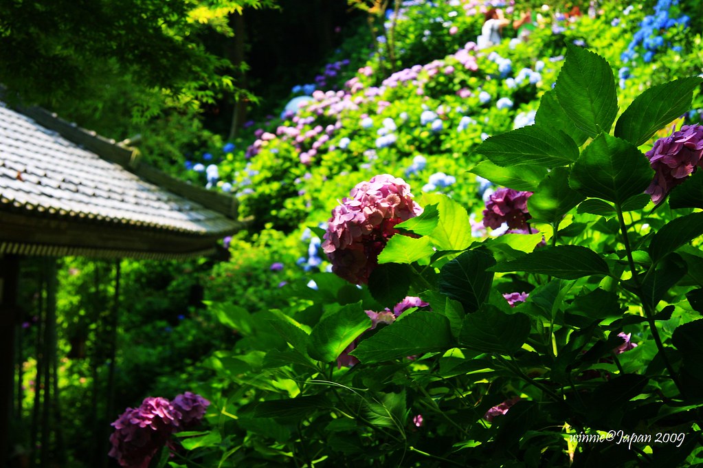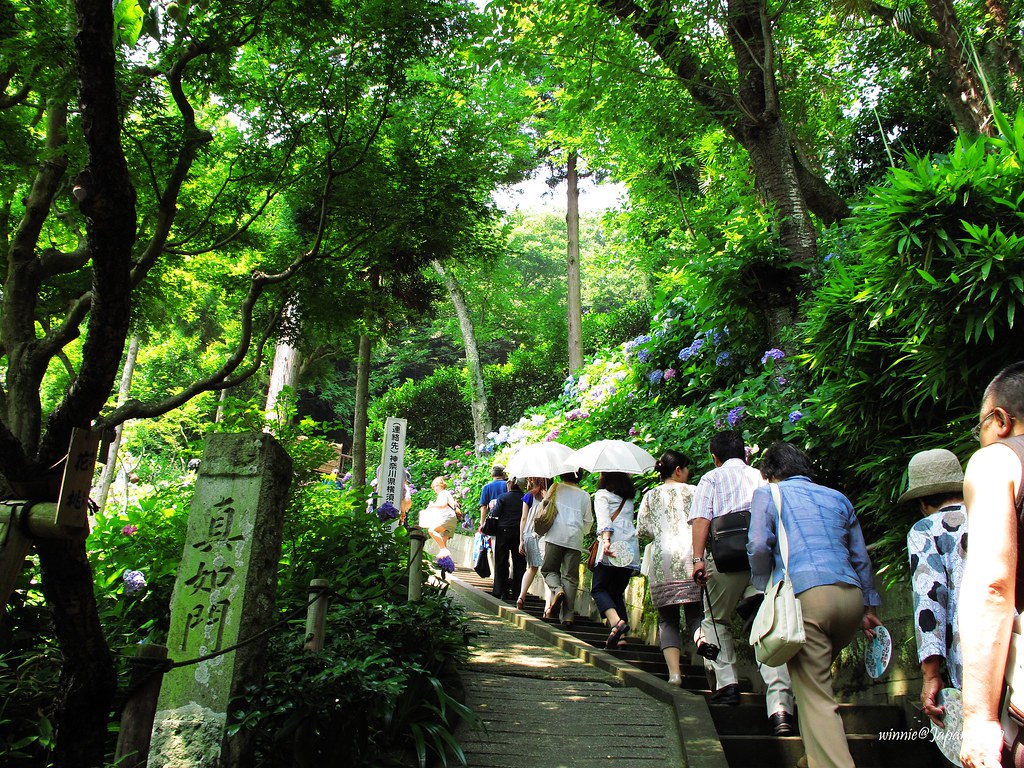 觀音堂旁的山坡,環山闢為「眺望散策路」,步道兩側40種以上、約2500株紫陽花迎風綻放,遠遠望去像一座紫陽花山。為了因應花季,堂前特別闢出「排隊等候區」,遊客多的時候採取流量管制,往往要等上好幾小時才能上山。寺方還很貼心的印製非常精美的紙扇分贈遊客,這可是花季限定呢!我們一早就來到寺院,很幸運的不必排隊就能直接上山,體驗被花海簇擁的樂趣。走到最高點,左眺廟宇浮現花海綠蔭中,右望海天ㄧ色相模灣,置身如詩如畫又充滿禪意的美景中,令人忘卻時間流逝!