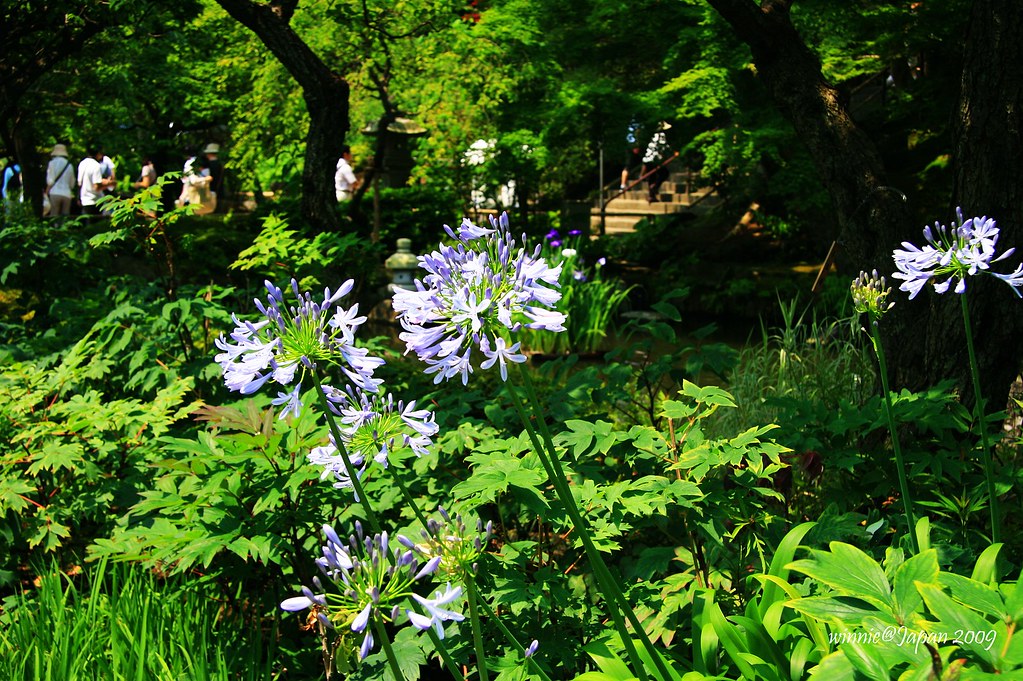 付過大人三百小人一百的入山券,進入山門,眼前展現一片廣大庭園。初夏時分,草木扶疏花朵盛開,花菖浦、桔梗、木槿、荷花等爭奇鬥艷,烏龜悠遊在池裏,蜻蜓漫舞水邊,還沒看到紫陽花,已經被萬紫千紅薰得飄飄然。將近五十種花卉隨四季更迭輪番上陣,難怪長谷寺有「鎌倉的極樂西方淨土」美譽。