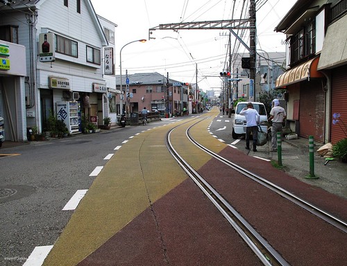 江ノ電在腰越到江ノ島兩車站間的鐵軌是埋在馬路中間,