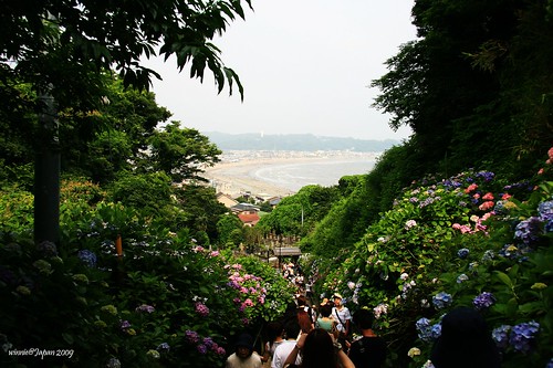 這條叫做極樂寺坂的山路,在極樂寺旁,紫陽花季只看得到萬頭鑽動,前方就是相模灣
