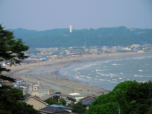 拉近一點看相模灣,這一帶是有100多年歷史的鎌倉海水浴場,可以看得出人不少