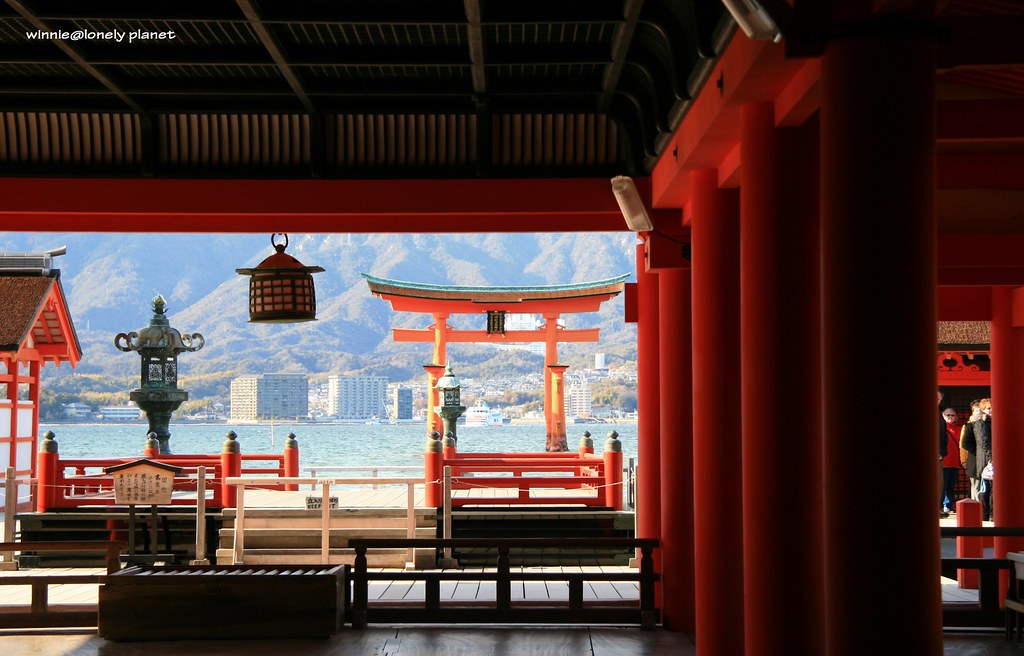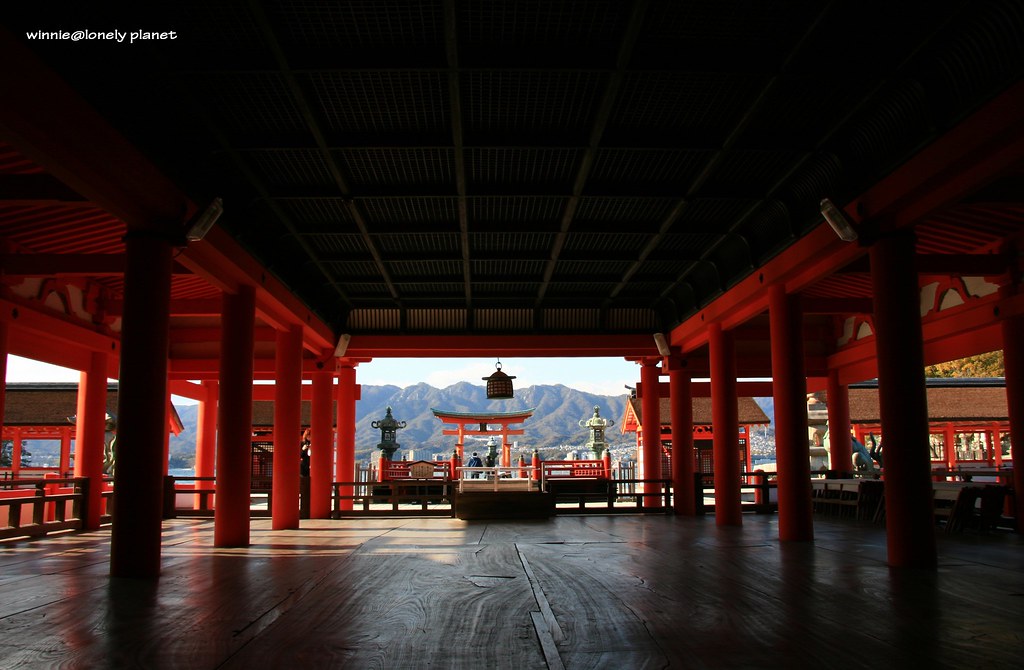 從迴廊眺望鳥居,莊嚴華麗朱紅色社殿與大鳥居靜靜漂浮在海上