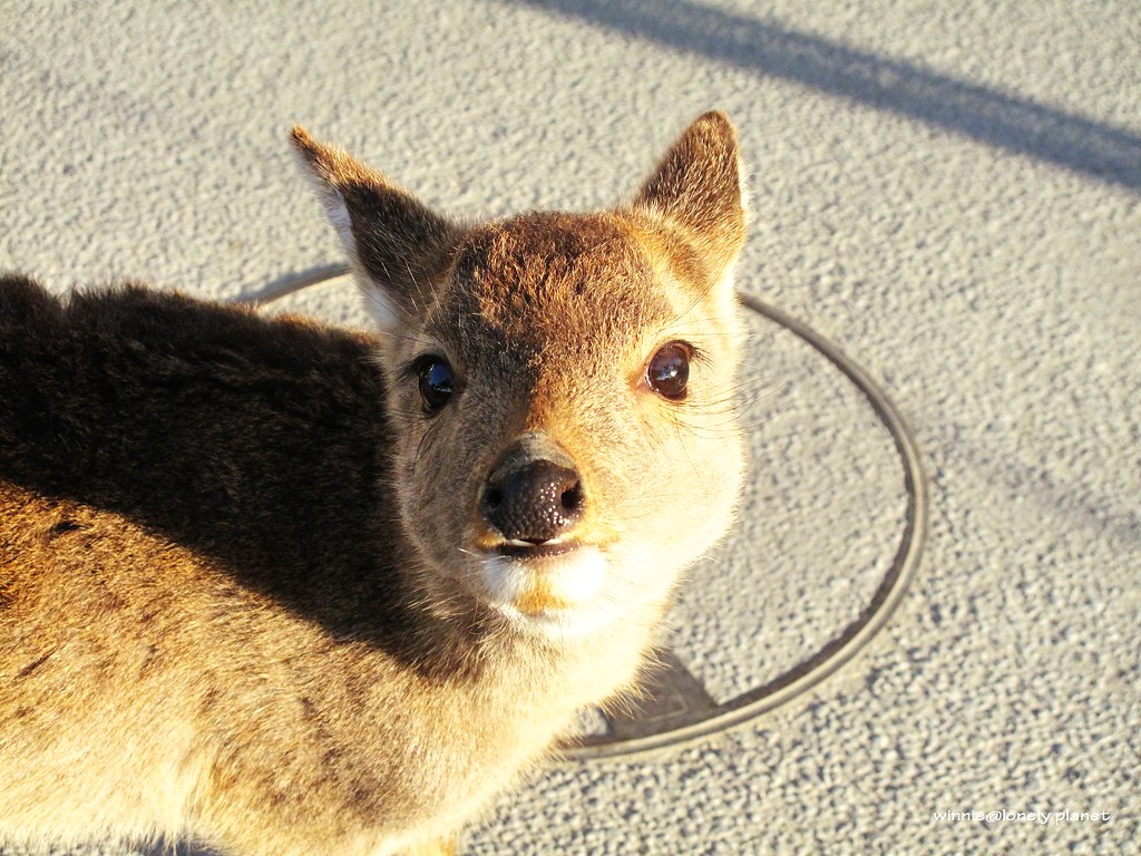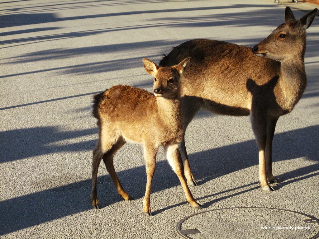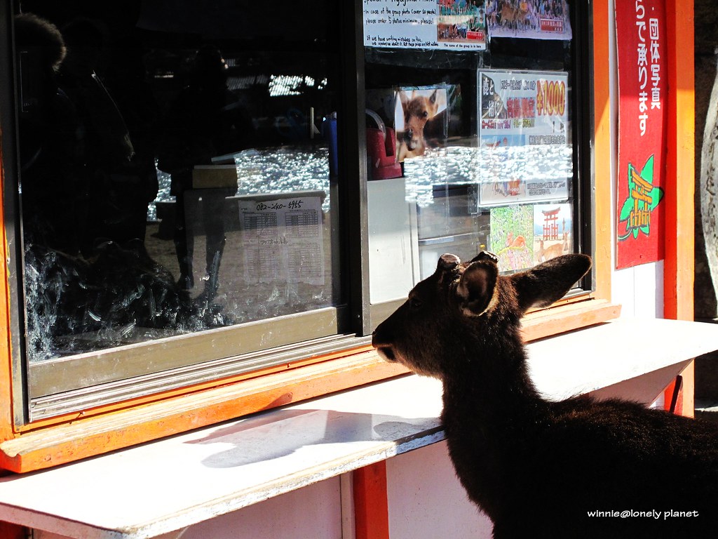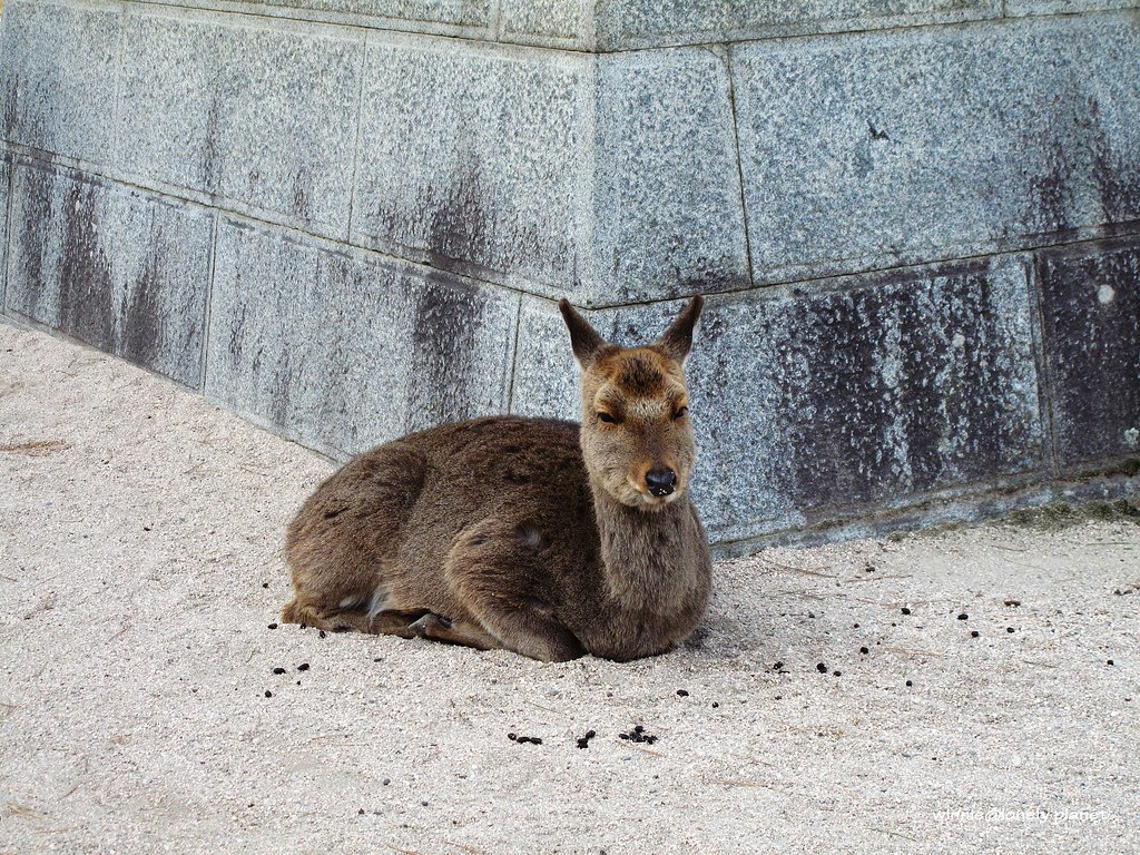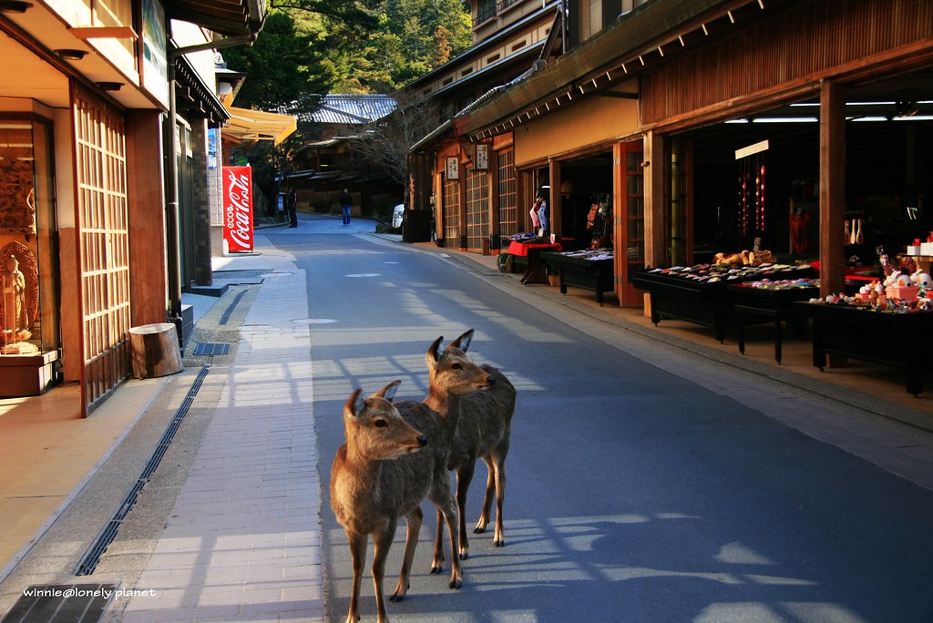 宮島的鹿比較斯文,不會像奈良的鹿一直戳人要東西吃,當然從他們楚楚可憐的眼神看得出來還是很想吃東西的,只是嚴島和奈良不同,這裡沒有賣奈良的鹿仙貝,也嚴禁遊客餵鹿。我們就因為受不了小鹿的可憐模樣拿餅乾餵牠吃,被旁邊商店的阿婆制止,其實這樣是對的,畢竟亂吃還是容易危及鹿的生命,所以來到嚴島記得不要餵食鹿!
